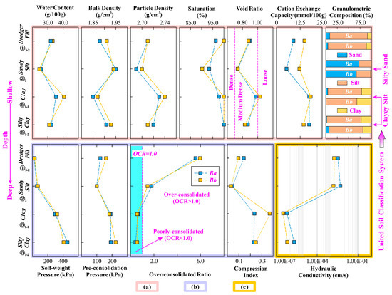 The geological features of the soil layers around Ba and Bb boreholes. (a) Basic Properties, (b) compressibility, and (c) permeability. Note that according to the United Soil Classification System, the ②3 Sandy Silt, ⑤1-1 Clay, and ⑤1-2 Silty Clay could also be named as silty sand, clayey silt, and clayey silt, respectively. In order to ensure the consistency of soil layers and to facilitate the description, the soil classification in the results and discussion section still uses the soil type (Figure 3) that was determined by the geological age, soil behavior, and physical and mechanical properties.