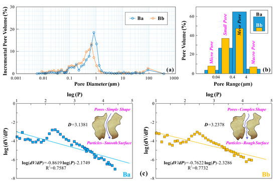 The micro-scale pore characteristics of the clay around the Ba (CLBA) and clay around Bb (CLBB). (a) Pore distribution, (b) pore type, and (c) morphological fractal dimension.