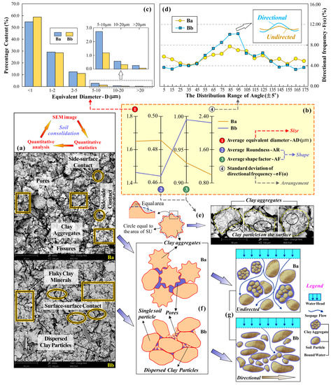 During the permeation process, the SUs may move or rotate [62], which may promote or hinder the following consolidation. The evaluation of soil microstructure starts from SEM images, through statistics and analysis, and then returns to SEM images (Figure 9a). Further, by quantitatively analyzing the microscopic parameters (Figure 9b), the relationship between soil consolidation and microstructure could be clarified. It can be seen that the AD of CLBB (1.46 μm) is significantly lower than that of CLBA (1.65 μm). The SEM-based AD is in good agreement with the granulometric composition. Figure 9c also demonstrates that the content of SUs less than 1μm of CLBB is 58.84%, which is higher than that of CLBA (54.81%); the contents of SUs in other divided intervals (>1 μm) of CLBB are lower than those of CLBA. As a result, the water in the pores of CLBB may suffer from a stronger binding effect derived from hydration film because of more small SUs during the process of consolidation and drainage.