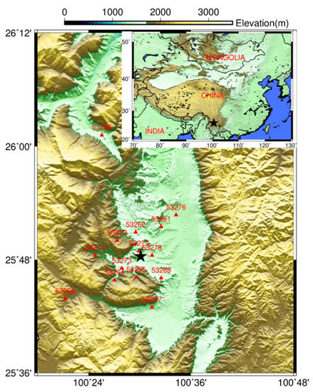 We target the Binchuan region because it is located at the eastern margin of the collision zone between the Indian and Eurasia plates, accumulating strong shear strain [45], accommodating millions of people, and experiencing many devastating earthquakes. The largest one was the M7.75 Yongsheng earthquake which occurred on the Chenghai fault in 1515 [46,47]. This region has recorded numerous earthquakes, including eight events with magnitude greater than 7, and 70 with magnitudes greater than 6 [48].