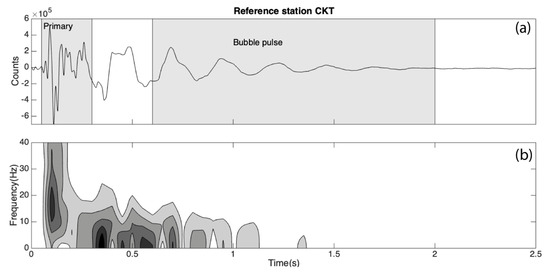 We first inspect the waveform recorded at the nearest station CKT, which is ~50 m from the airgun source. A near-field airgun wavelet is composed of primary pulse and bubble pulse (Figure 2). Primary pulse is generated by high-pressure gas releasing into the water and is usually in high energy with a wide bandwidth, e.g., 7 to 30 Hz (Figure 2). It was mostly used in shallow oil and gas exploration. In comparison, bubble pulse is generated by the oscillation of bubbles after high-pressure gas was released into the water. It is in a relatively low-frequency band from 2 to 6 Hz [36,38], so it was often used in deep seismic exploration (Figure 2).