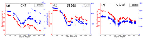 Seasonal variation of the dominant frequency (red) and P-wave signal amplitude (blue) for the reference station (a) and other receivers (b,c). They decrease in the summer and correlate to each other.