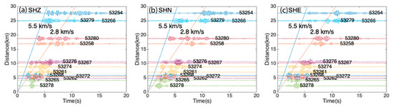 We interpolate the airgun signals to 0.001 s/sample and bandpass all waveforms with a 2–6 Hz filter, the dominant frequency band of the bubble pulse [38]. With the single shot data, we can observe clear P-wave and S-wave arrivals up to 30 km with apparent velocities of 5.5 km/s and 2.8 km/s, respectively (Figure 4), consistent with previous observations [38].