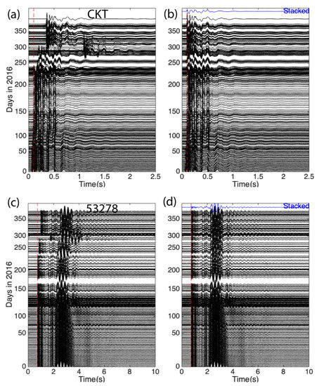 Waveform cross section of vertical components at the reference station, CKT (a), and one receiver 53278 (c). Waveforms are aligned with the original time of each shot (b,d). Strong clock drifts in the reference station and receivers start around days 230.