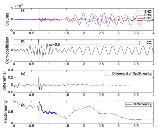 Due to interference of noise in the airgun signals, we cannot directly determine the P-wave arrival time from the maximum of rectilinearity in different moving windows. We first select a P-wave template and compute moving window correlation coefficient between the template and each raw vertical waveform. We then select points with correlation coefficient greater than 50% of the maximum value (Figure 6b). Among these points, we determine an arrival time with the maximum differential rectilinearity (Figure 6c). From the arrival time to 0.5 s after it, we finally determine the P-wave arrival time from the maximum value of the rectilinearity (Figure 6d).