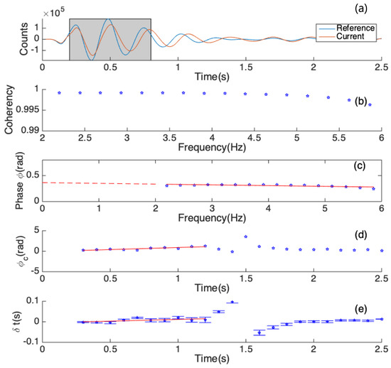 All the above steps are used to compute one data point at the time 0.5 s in Figure 7d,e. If we obtain delay-time and constant phase shift estimations for all moving windows, we can further estimate how they vary with the travel time. For each measurement with window centered at second,