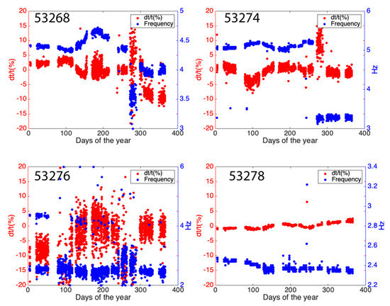 in which and are Fourier spectrum of the receiver and source signals, respectively. We treat the recording at the reference station CKT as the source signal. The asterisk represents the complex conjugation. ranges from 0.01% to 1%, depending on the signal-to-noise ratio. We use a same value 0.01% as of [18] because of high-quality of our datasets. We finally invert frequency-domain Green’s function to time-domain time-series through inverse Fourier transform. If deconvolution can completely remove source effect, we should observe constant dominant frequency within one-year cycles, and seasonal change should be in the same magnitude with these values measured from ambient noise, which is usually less than 1%. After deconvolution, we observe that the dominant frequency of P-wave in these empirical Green’s functions correlates inversely to the delay time change (Figure 9). The dominant frequency still shows seasonal variation, which causes obvious phase shift and affects the differential time calculation. Thus, deconvolution cannot eliminate the source effect on computation of differential time.