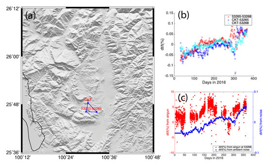 dt/t(%) measurements (b) from ambient noise among CKT, 53265 and 53268 (a) and dt/t(%) measurements from airgun at the station 53268 (c).