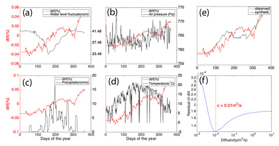 Investigation of mechanism for seasonal changes in seismic travel time from ambient noise. Seismic travel time changes do not obviously correlate to the water table fluctuation of the reservoir (a), local precipitation (c), air pressure (b), and temperature (d). (e) Seismic travel time changes modeled from a poroelastic physical model match with the observed ones. (f) The optimal diffusivity is 0.01 m2/s for a minimum residual between synthetic and observed seismic velocity changes.