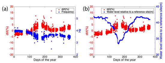 To understand the effect of the change in source property on travel time measurements, we compare seasonal change in travel time to the dominant frequency (Figure 13). We observe that is inversely correlated to the dominant frequency of P-wave and water level fluctuation in the reservoir. One possible explanation is that water table fluctuation in the reservoir causes signal frequency content change so that we can observe phase shift. The authors of [65] observed that signal amplitude changes are positively correlated to significant travel time delay, which is opposite to our observation. Since the change in source property cause significant effect on deriving seasonal change in seismic travel time, we should put more attention on stabilizing dominant frequency of airgun signals in further experiments.