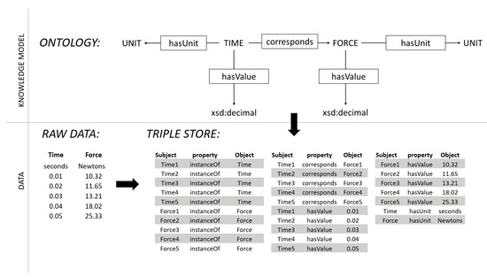 The ontology plays a purely functional role in the digital workflow. The main objective is to transform experimental data into triples (see Figure 7) irrespective of the source format. These triples are semantically connected according to the ontology, which fulfills a “scaffolding” role. This means that the ontology, once used to build the knowledgebase file, remains unaffected by the digital workflow. The value of a bottom-up development and collaboration approach to OEngMs has been demonstrated. Both the development and the collaboration here remain horizontal. Semantic reflections and tasks are used to transform the data into triples, but not to update the ontology. The importance of a feedback loop between the ontology engineer (OE) and the DE to adjust this digital workflow and the selected ontology has been recognized, but not yet implemented. The feedback loop includes activities such as ontology updating (minor changes), ontology restructuring (analyzing the initial knowledge model and correcting the ontology according to the result of this analysis), ontology pruning (discarding entities that are no longer relevant) or ontology customization (adapting the ontology to some user needs) [49].