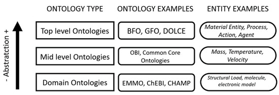According to the level of conceptualization (see Figure 2, ontologies can be classified into one of the following categories: top-level ontologies, mid-level ontologies, and domain ontologies. Top-level ontologies (also called upper ontologies or foundational ontologies) deal with the highest level of conceptualization. These ontologies include abstract general concepts and properties and are used as a basis to build other ontologies with a lower level of conceptualization [71]. Among the most popular are the Basic Formal Ontology (BFO) [72], the Descriptive Ontology for Linguistic and Cognitive Engineering (DOLCE) [73], Suggested Upper Merged Ontology (SUMO) [74], or the General Formal Ontology (GFO) [75]. The authors of [76] illustrated the dependency of the subsequent data structures on the choice of a top-level ontology. Mid-level ontologies are conceptually one level below. They are based on upper-level ontologies and provide entities to ontologies of a wide domain. The subject of [77] is a set of mid-level ontologies based on the BFO. Finally, domain-level ontologies “are developed to represent the knowledge and terminology specific to a professional, scientific, or similar domain” [78]. Domain ontologies, as ontological tools, are closer to the definition of the interoperability problem in the corresponding domain. Their classes and properties are tied closely to the concepts related to the specified part of reality that a domain stands for. Some examples in the fields close to the NDT domain (engineering, MS) are European Materials & Modelling Ontology (EMMO) [79], Chemical Entities of Biological Interest (ChEBI) [80], or Coordinated Holistic Alignment of Manufacturing Processes (CHAMP) [81].