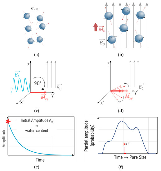 NMR Principles, adapted version from [5]. (a)—Initial state in a water-containing medium without magnetization. (b)—Alignment of the protons when the sample is exposed to a static magnetic field. (c)—Deflection of the resulting magnetization into the transverse plane (x-y) by a short radiofrequency pulse. (d)—The magnetization relaxes back into the equilibrium state after termination of the radio-frequency pulse. (e)—Resulting measurable NMR signal (exponential decay of NMR amplitude). (f)—Relaxation time distribution as a result of a numerical inversion of the measured decaying signal. When converted using a material constant ρ, the x-axis can be converted to pore sizes.
