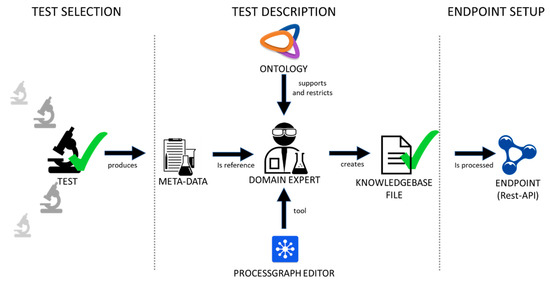 The digital workflow consists of three steps (see Figure 6). The first step is Test Selection, where a research method of interest is selected. The factors influencing this selection are multivariate: the availability of human resources, the need to have the triples available, the previous status of the research group with respect to the digitization of test data, etc. The Test Description follows, where the domain expert (DE) describes the test method considering its data output and metadata parameters. The DE uses a process graph editor software tool to create a knowledgebase file. This “method description” is a temporal sequence, from test preparation to data results. This tool represents the test method in terms of entities, and properties connecting these entities. Entities are described by the DE and must belong to classes from the chosen ontology. The properties used by the DE must be available in the same ontology (the BWMD-Ontology in this case). The last step is the Endpoint Setup, where the knowledgebase file from the previous step is processed to create an endpoint. This file acts as “translator” for all experimental output files of the test method selected in the first step. This endpoint is able to create triples (subject-property-object) using the original experimental data output and metadata parameters. Thereby, subjects and objects are instances of the classes in the selected ontology and the properties are selected from the ones available in the same ontology. Instances are concrete cases of a given class or category: specimen_43 is an instance of the class Specimen.
