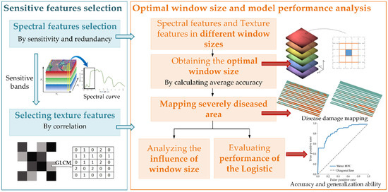 We aimed to combine texture features in the optimal window size and sensitive spectral features to realize the detection of wheat FHB in different time periods. The main steps are shown in Figure 2. In the beginning, according to the influence of FHB on wheat and the spectral response characteristics of wheat to FHB [33,34,35,36], the spectral features and bands that were sensitive to wheat FHB were selected through both correlation and redundancy evaluation, and texture features were extracted from the selected band images. Subsequently, texture features in different window sizes combined with the selected spectral features were used to detect the early-stage and late-stage wheat FHB in the studied field. According to the results, the influence of the window size of texture features on the detection accuracy and results was estimated, and therefore, the optimal window sizes in different periods were obtained.