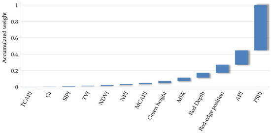For the selection of spectral features, we first calculated some spectral indices through original band combinations or spectral curve characteristic extractions, to indicate different aspects of host growth [37,38]. For instance, vegetation pigment content includes chlorophyll and anthocyanin (considered by the Structure Insensitive Pigment Index (SIPI), Transformed Chlorophyll Absorption Reflectance Index (TCARI), Anthocyanin Reflectance Index (ARI), Red-edge Position, and Green Index (GI)), the leaf area index or biomass (considered by the Normalized Difference Vegetation Index (NDVI), Modified Simple Ratio Index (MSR)), and the crop growth or stress state (considered by the Plant Senescence Reflectance Index (PSRI), Modified Chlorophyll Absorption Ratio Index (MCARI), Triangular Vegetation Index (TVI), and Nitrogen Reflectance Index (NRI)). Then, the spectral features were obtained while considering two points, that is, the redundancies among the selected indices, and the sensitivity of each index to FHB. The Kendall correlation coefficient, a nonparametric method, was calculated to illustrate the correlations among the indices; and the correlations between the indices and the disease rate [39]. In addition, the Relief algorithm was used to acquire the explanatory weight of these indices to indicate their relative importance in discriminating the disease patterns [40]. The studied wheat was in the same growth period during the experiments conducted on May 3 and May 8 and the changes in its spectral features between the two sampling dates were mainly due to the development of diseases rather than the growth of the plants. Therefore, when selecting the sensitive spectral features and the bands containing the most disease information, the two-day experimental survey data, that is, the 80 groups of samples marked as characterizing severe disease or light disease were combined. Figure 3 shows both the actual relief weights of all spectral indices and their accumulated weights for distinguishing between severe and slightly diseased samples. Initially, when the accumulated weight was more than 0.9, four parameters, including the PSRI, ARI, Red-edge position, and Red Depth were selected. Then, according to the results of the Kendall correlation coefficients among the spectral indices (Figure 4), the correlation between the Red-edge position and Red Depth was approximately 0.6, indicating redundancy. Therefore, the PSRI, ARI, and Red-edge position were chosen to describe crop growth and disease stress.