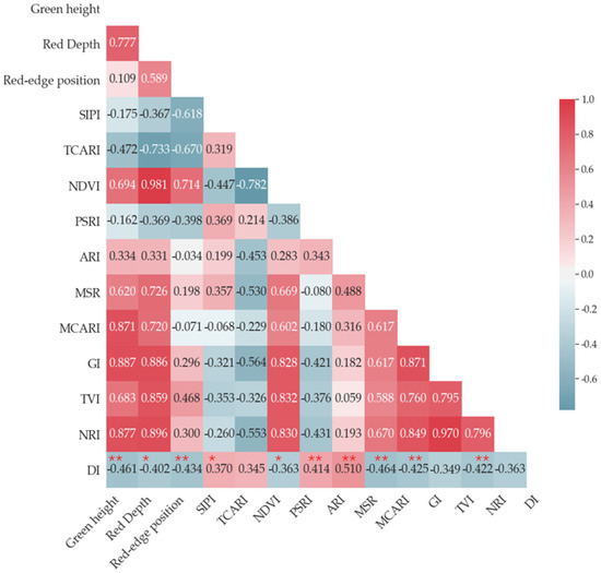 Kendall results among the spectral indices and between each spectral index and disease rate (the last line). The middle part is the Kendall correlation coefficient between the spectral indices of the corresponding row and column. The Kendall and T-test results for the disease rate and each spectral index in the corresponding column are shown in the last row, in which “*” corresponds to the 90% confidence interval and “**” corresponds to the 95% confidence interval.