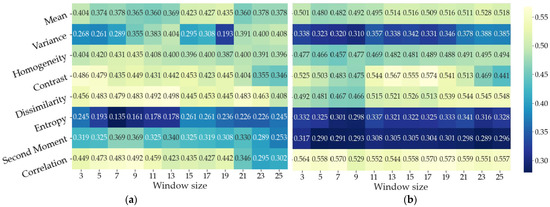 Therefore, we adapted the GLCM to calculate texture features and study the gray level distribution of pairs of pixels. The method is a classic texture feature extraction method and is widely used to plant disease detections [50,51,52]. When applying the model, some researchers focus on the influence of different parameters of the GLCM on the detection results. Ye et al. used hyperspectral images to detect the bruised potatoes by calculating texture features based on the GLCM. To obtained the optimal parameters of the GLCM, they set different gray levels (L) and sliding step sizes (D), and the results showed that the best detection results were obtained when L was eight and D was eight; the accuracy reached 93.75% [22]. For high-spatial-resolution images, Guan et al. utilized texture features extracted from multispectral images captured by UAVs to detect maize lodging. The results showed that the optimal window size of the GLCM for lodging detection was 17, which was close to the measured area of single lodged maize, obtaining an average accuracy of 82.84% [30]. In our study area, the planting density and direction were uniform, while the size of the severely diseased area changed with FHB development. Therefore, the main parameter that contributed to the differences in texture features between slightly and severely diseased sites was the window size. A suitable window size for texture feature calculations can better illustrate the spatial distribution patterns in different stages and therefore provide more accurate and reliable detection results. Gray images were used to extract the mean, homogeneity, contrast, dissimilarity, and correlation of the GLCM results obtained with different window sizes. When inputting each group of features, we found that FHB can be more accurately detected by using a smaller window size in the early stage and a larger window size in the late stage, and higher accuracies were obtained when the window size was closer to the optimal window size. This result is consistent with the theory of the influence of the window size on the texture information when the GLCM is used [53].