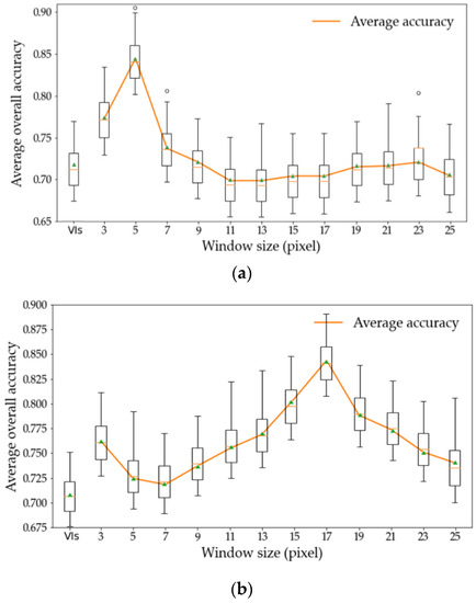 The average values and a box map of the model accuracies. Obtained utilizing only spectral features (the leftmost) and combined spectral features and texture features in windows of different sizes (right), on May 3 (a) and May 8 (b).