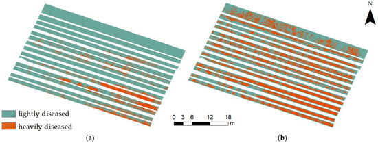 Severely diseased area detection performed by using selected spectral features and the texture features in the optimal window size. (a) The results on May 3, when the optimal window size was 5 × 5 pixels; (b) the results on May 8, when the optimal window size was 17 × 17 pixels.
