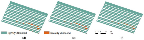 Furthermore, to explore the influence of texture features in different window sizes on the model performance and detection results, we used the texture features in windows with sizes of 5 × 5, 9 × 9, 13 × 13, 17 × 17, 21 × 21, and 25 × 25 pixels (4 cm for each pixel) to obtain the distributions of the severely diseased areas on May 3 and 8 (Figure 8 and Figure 9). From the mapping results, the larger the window from which texture features were extracted was, the less severe the FHB area was, regardless of whether the early or late stage was considered. Especially on May 3, when the window was larger than 13 × 13 pixels, less sporadic severe areas could be detected, and when the window was 25 × 25 pixels, the contiguous severe areas became broken. On May 8, when the window size was less than 13 × 13 pixels, the area changed little with the window size, and its distribution was very dense. When the window size was larger than 17 × 17 pixels, the area began to decrease, and the area also decreased significantly when the size was 25 × 25 pixels. The results showed that the texture features extracted from different window sizes impact the disease detection in the early and late stages, and selecting the appropriate size increases the accuracy of the results.