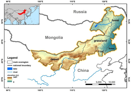 The study area and three major terrestrial biomes (e.g., forest, grassland, and desert). The information of biomes is derived from the WWF Terrestrial Eco-region map (available from: http://ecoregions2017.appspot.com/, accessed on 7 May 2021).