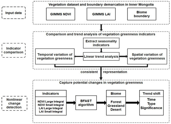 Flowchart showing the detailed steps in detecting vegetation greening over Inner Mongolia.