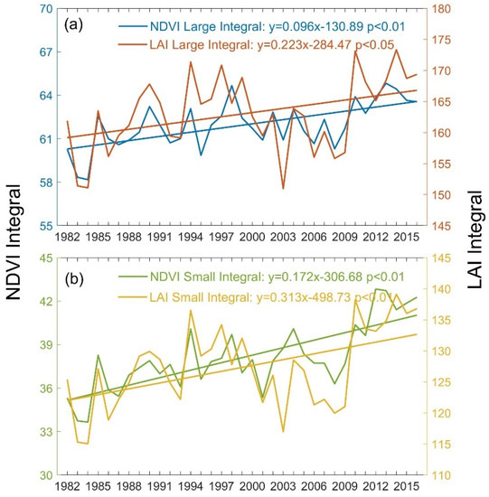 Variations of NDVI/LAI (large/small) integrals in Inner Mongolia from 1982 to 2016. (a) NDVI/LAI large integrals; (b) NDVI/LAI small integrals.