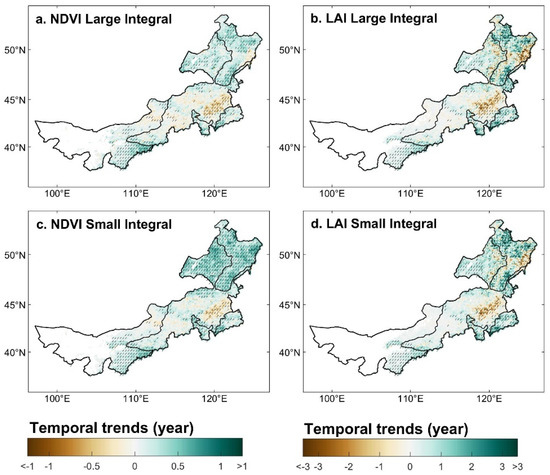 We find the spatial patterns of changes in LAI integrals are consistent with NDVI over most regions of Inner Mongolia, both for the large integral and small integral (Figure 4). Area with increasing LAI integrals accounted for 67% and 73% of the vegetated area, and around half of these areas were statistically significant (Figure 4b,d). However, although the spatial trend of NDVI/LAI integrals was similar for most regions, the opposite trends were minor, as in the northeastern part of Inner Mongolia, which was dominated by forest biomes.