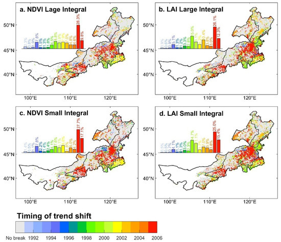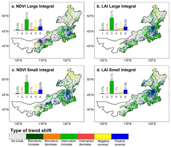 LAI integrals and NDVI small integral (Figure 7b–d) follow a similar spatial pattern as NDVI large Integral. Compared with the NDVI/LAI large integrals, a more greening area is found by the NDVI/LAI small integrals. Noticeably, by comparing with the results under the simple linear trend (Figure 4 in Section 3.1), the results obtained under the breakpoint detection analysis were not consistent, which implied that these relatively short-term changes may be masked by a long-term linear trend. According to the linear analysis, the vegetation browning area experienced in the eastern part of Inner Mongolia (Figure 4) was found reversed towards the direction of greening by the nonlinear analysis (Figure 7). However, partial areas in north Inner Mongolia were changing from greening to browning (Figure 7).