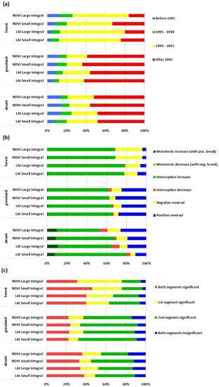 Statistic per biome on to the (a) the type, (b) the timing, and (c) the significance of the trend shifts in NDVI and LAI integrals during the period 1982–2016. Statistics are expressed as a percentage of an area within each biome. Pixels without trend breaks are not considered.