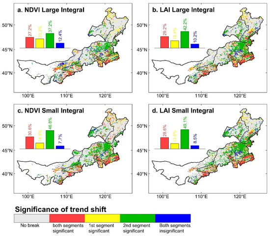 Spatial distributions of the significance of trend shift (p < 0.05), (a) NDVI large integral; (b) LAI large integral; (c) NDVI small integral; (d) LAI small integral. Pixels with no breakpoint are reported in grey while white areas indicate regions with no data (i.e., non-vegetated areas or missing data). The histograms above each map summarize the distribution of four types of significant changes.