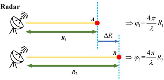 GB-SAR measurement is based on the differential interferometry technique, which utilizes the variation of the target’s phase to obtain high-precision deformation information []. The basic principle is shown in Figure 1. Consider a deformation target observed twice by a GB-SAR system, under ideal conditions, the interferometric phase can be expressed as: