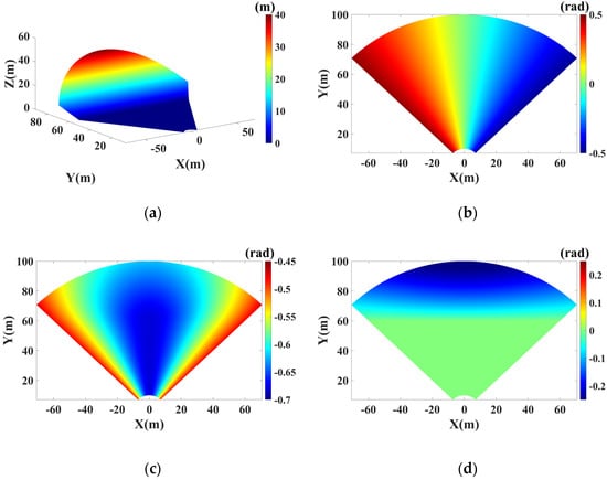 where the parameters represent the repositioning error components, which can be estimated with the least square (LS) method. To illustrate the effects of repositioning error, the interferometric phases under different types of radar offsets are simulated. Figure 3a shows a three-dimensional (3D) topography consisting of a flat and a slope. As shown in Figure 3b, when the repositioning error is just set along the azimuth direction with , the error phase changes linearly with the azimuth angle. When the repositioning error is set as , whose direction is perpendicular to the azimuth, increases non-linearly with the azimuth angle, as shown in Figure 3c. For Figure 3d, there is only repositioning error component in the vertical direction . It can be noted that the error phase on the flat is zero, and gradually increases with the slope height.