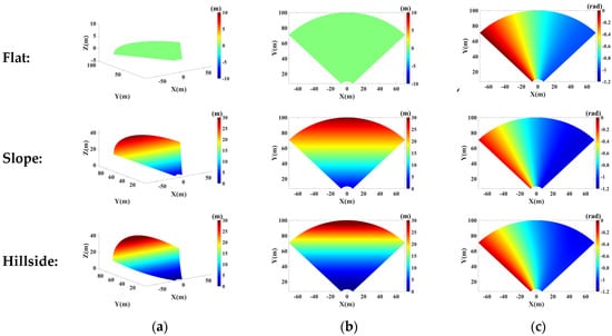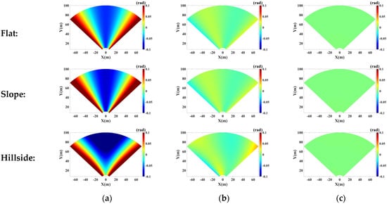 The unknown parameters and error phase can be estimated based on the least square method. A numerical simulation is made to compare the compensation effects of the above three models. This paper simulates three types of topographies: flat, slope and hillside, as shown in Figure 4a. Their x-coordinate range is all from −70 m to 70 m, and y-coordinate range is all from 10 m to 100 m. For the slope, its height linearly increases with the y-coordinate and varies from 0 m to 30 m. For the hillside, the height changes irregularly with y-coordinate from 0 m to 30 m. Assuming the repositioning error along three axial directions are all 1 mm, i.e., , Figure 4c shows the error phase maps corresponding to three terrains.