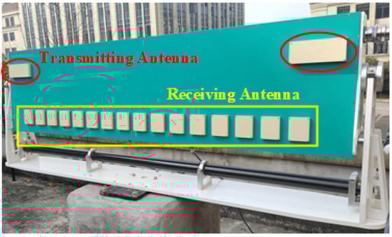 Figure 6 shows the photo of the ground-based multiple-input-multiple-output (GB-MIMO) radar, which uses 16 transmitting antennas and 16 receiving antennas to synthesize an equivalent linear array with 256 phase centers []. The GB-MIMO radar works at the Ku-band, and its transmitted signal is frequency-modulated continuous wave. Table 2 shows the specific parameters of the GB-MIMO system. Note that the cross-range resolution is not constant, ranging from 0.39 m at the near range of 50 m up to 7.81m at the far range of 1000 m.