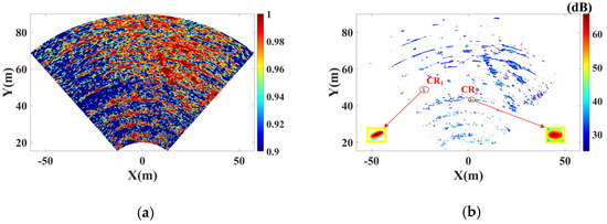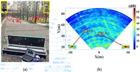 Figure 7a shows the experimental scenario, which is an outdoor lawn located in the Chongqing Innovation Center of Beijing Institute of Technology. The GB-MIMO radar is set on an observation platform. Two corner reflectors (CRs) are utilized as reference points. The red circles mark the CRs, and the yellow blocks show enlarge images. Figure 7b shows the radar image, which could be regarded as a signal-to-noise ratio (SNR) map. Pixels with SNR above 60dB correspond to streetlights, seats, and buildings.