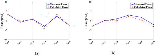 Using the total station to obtain the 3D coordinates of both CRs, combining with the radar offsets in Table 3, the theoretical values of repositioning error phases of both CRs are obtained with Equation (6), as shown with the red dotted lines in Figure 9. The blue solid lines show the measured curves of interferometric phases of both CRs with IM1~IM6. Due to the millimeter-level positioning error of the total station, there are slight differences between these curves, but it could still prove that the proposed method can model the repositioning error precisely.