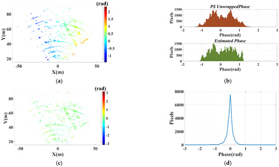 As mentioned in Section 3, the repositioning error and the atmospheric phase of these PSs are jointly compensated by the iterative LS method. Figure 11b shows histograms of the unwrapped phases and estimated phases. Figure 11c shows the compensated phase map. Figure 11d shows the phase distribution curve after the error compensation. For most PSs, their compensated phases slightly deviate from 0 rad, which proves that the error phases have been well compensated with the proposed method.