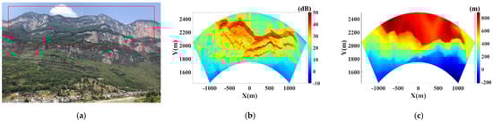 Figure 13a shows the photo of the experimental scenario, where the monitoring scenario is marked in red box. Figure 13b is the signal-to-noise (SNR) map of the scenario. Those pixels with SNR above 30 dB correspond to the bare rocky slope. The difference of height between the radar and experimental scenario is shown in Figure 13c.