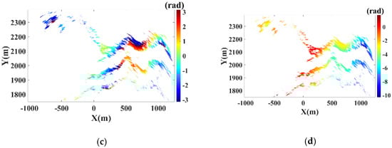 Take IM1 as an example for phase analysis, the phase unwrapping is performed based on the Minimum Cost Flow method []. The unwrapped phase map of PSs is shown in Figure 11a. The interferometric phases of most PSs deviate from 0 rad due to the repositioning error. The topography of experimental scenario is mainly flat, so the linear range model of the atmospheric phase component in Equation (13) is utilized. Since that the radar was not moved in the height direction, the phase model in Equation (14) can be simplified as: