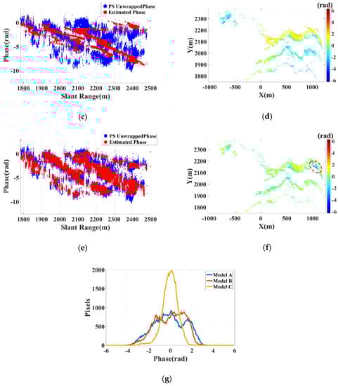 The corresponding phase scatter diagrams are SDA, SDB, SDC, as shown in Figure 15a,c,e. Obviously, the phase scatter could be better simulated with Model C. The compensation results are CIMA, CIMB, CIMC, as shown in Figure 15b,d,f. Figure 15g shows the phase distribution curves of the residual phases under different models. Compared with the improved method, there are a large number of PSs deviate from 0 rad with Model A and B. According to the on-site investigation, there were no obvious deformations for the high and steep rocky slope during the experiment. We could conclude that the best compensation performance could be achieved with the improved multi-parameter model. However, the red circle in Figure 15f marks a deformation area, where the negative deformations denote the direction away from the radar.