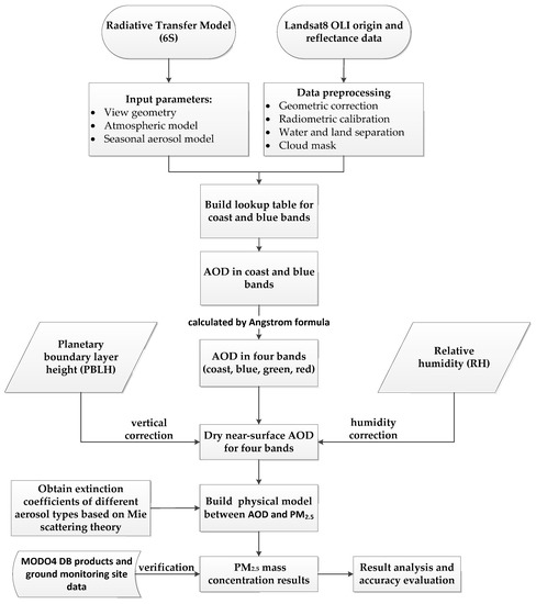 The workflow of our proposed method is shown in Figure 2. First, Landsat8 OLI data preprocessing was performed, and the input parameters of the Second Simulation of the Satellite Signal in the Solar Spectrum (6S) model were set to generate a lookup table for the coast and blue bands. Second, according to the generated lookup table, the surface reflectance and apparent reflectance data were brought into the radiation transmission model to obtain the AOD of the coast and blue bands, and then the Angstrom formula was used to derive the AOD of the green and red bands. Third, vertical correction and humidity correction were performed using PBLH and RH data based on the entire atmospheric AOD to obtain dry near-surface AOD. Fourth, a physical model between the dry near-surface AOD and PM2.5 mass concentrations was established based on Mie scattering theory. Fifth, the PM2.5 mass concentration was solved by using multiband dry near-surface AOD. Finally, result analysis and error estimation were performed on the AOD and PM2.5 retrieval results.