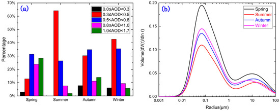 (a) The statistical distribution of AOD percentages and (b) average volume size distributions of particulates in different seasons.