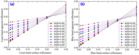 In addition, to demonstrate the feasibility of AOD retrieval for various bands of Landsat8 OLI, the changes in the sensitivity of the TOA to the surface reflectance at different AOD values were analyzed by using the 6S model. In the simulation, the view geometry was set as , °, and = 120°, and the aerosol model and atmospheric model were set as custom and mid-latitude winter model respectively. Figure 4 shows that the TOAs of the four bands were all sensitive to the surface reflectance, and there was a threshold point at a surface reflectance of 0.2. When the surface reflectance was less than 0.2, the TOA increased with increasing AOD. When the surface reflectance was greater than 0.2, the TOA decreased with increasing AOD. When the surface reflectance was fixed, it can be seen from Figure 4 that the TOA was gradually insensitive to changes in AOD as the wavelength increased, especially in the red band, the TOA changed very little with the growth of AOD. Therefore, it was reasonable to choose the coast and blue bands to retrieve AOD in this paper.