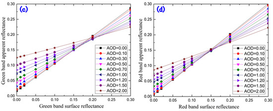 The sensitivity analysis of TOA in different bands ((a) coast band; (b) blue band; (c) green band; (d) red band) to surface reflectance and AOD.