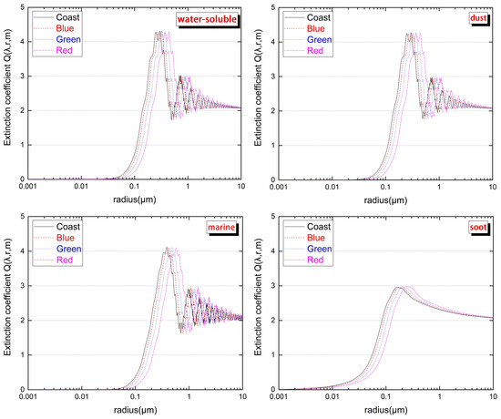 where , representing the scale parameter, and and are Mie scattering parameters that are related to the complex refractive index of the particle. The extinction coefficient of different aerosol particles is derived by obtaining the complex refractive index of these four particles [55]. Figure 5 shows that the extinction coefficient of different aerosol components varies with particle radius at the center wavelength of different bands. The trends of different bands were the same, but the peaks gradually moved to the shortwave direction for different bands. With increasing particle radius, the extinction coefficient oscillated and converged to 2. Then, the volume weight function can be determined based on the previous definition.