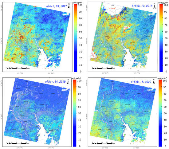 Using the physical model proposed above, the four-year Landsat8 OLI images of the PRD area in spring and winter were selected as the retrieval target because more rainfall leads to poor data in summer and autumn. The cloud coverage of all images was less than 10%, which was convenient for better retrieval results. In addition, water and land separation and cloud mask extraction were carried out before inversion, and no inversion was performed in the areas of water and clouds. Figure 6 shows the temporal and spatial distributions of Landsat8 OLI PM2.5 in the PRD for a certain day in different years. The PM2.5 mass concentrations on 12 February 2018 was higher than on 23 October 2017, and the pollution range was relatively wide on 12 February 2018, improved on 14 November 2019, and expanded again on 18 February 2020. The results on 23 October 2017 and 23 October 2018 showed that the PM2.5 pollution in the PRD region has a wide range, mainly distributed in Foshan, Guangzhou, Shenzhen, and Dongguan, which are highly industrialized cities. Lower pollution areas were mainly distributed in northern Guangdong, and the heavily polluted areas even exceeded 100 μg/m³. The results on 14 November 2019 showed that there was no large-scale pollution, and only a few regions had high PM2.5 values. However, PM2.5 pollution in the PRD has become more serious again since 18 February 2020, such as in Gaoming, Heshan, and Xinhui, which are distributed in southwestern Guangdong and are experiencing certain pollution.