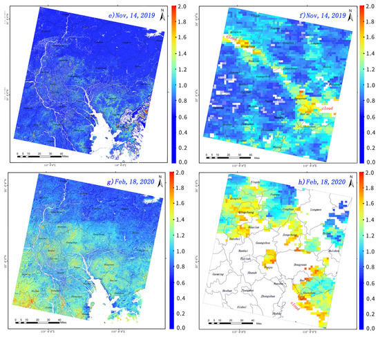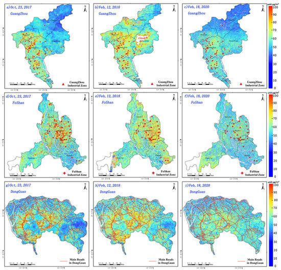In addition, the pollution sources of several major industrial cities in the PRD can be identified through the ultrahigh resolution retrieval results of PM2.5 concentrations. Therefore, the areas with high PM2.5 values in three years (except for 14 November 2019) were used to analyze the pollution status of Guangzhou, Foshan, and Dongguan cities.