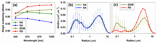 (a) Spectral variation in single scattering albedo and mean volume size distributions for (b) pollution aerosols (NA and SA) and (c) DDM and PD types detected by the RF model. Abbreviations: NA, non-absorbing; SA, strongly absorbing; DDM, dust dominated mixed; PD, pure dust.